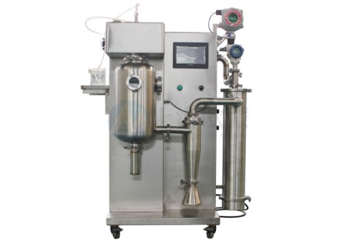 首先在開啟風機,加熱模塊,干燥塔體內充入氮氣,要被干燥的液態物料經輸液泵輸送至噴頭處,液態物料被霧化器霧化成細小液滴,液滴在干燥塔內與熱氮氣進行充分的熱交換,物料中的液態部分被瞬間蒸發,固態部分形成的粉狀物料沉于塔底,*后經過旋風分離器進行氣固分離至物料收集瓶,溶劑經過冷凝器回收,氣體循環利用。